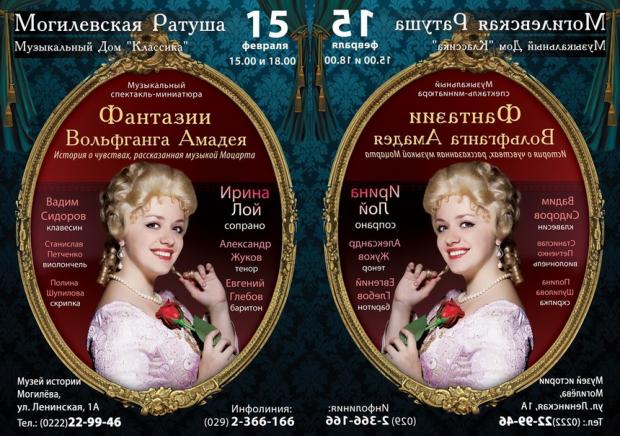 Музыкальный салон, открывшийся в конце декабря прошлого года в могилевской ратуше, вновь приглашает гостей. В этот раз зрителям представят музыкальный спектакль-миниатюру «Фантазии Вольфганга Амадея» в исполнении ансамбля старинной музыки «Кантабиле». Это потрясающая история о чувствах, рассказанная музыкой Моцарта, мечты и мысли великого композитора, воплощенные в его шедеврах… Гости услышат арии из его гениальных опер "Свадьба Фигаро", "Волшебная флейта", "Дон Жуан", и "Так поступают все".