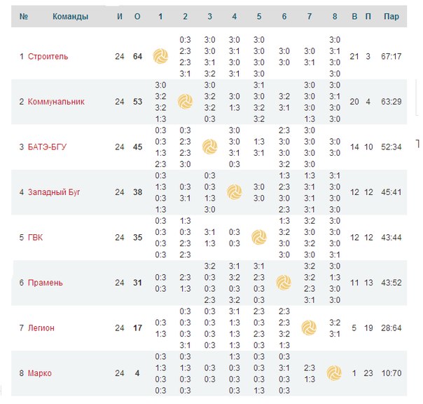 Таблица первенства Беларуси по волейболу среди мужских команд после 24 тура
