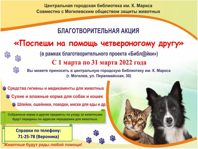 Городская библиотека им. К. Маркса совместно с обществом защиты животных «Доброе сердце» с 1 по 31 марта проводит благотворительную акцию «Твоя доброта поможет нам».