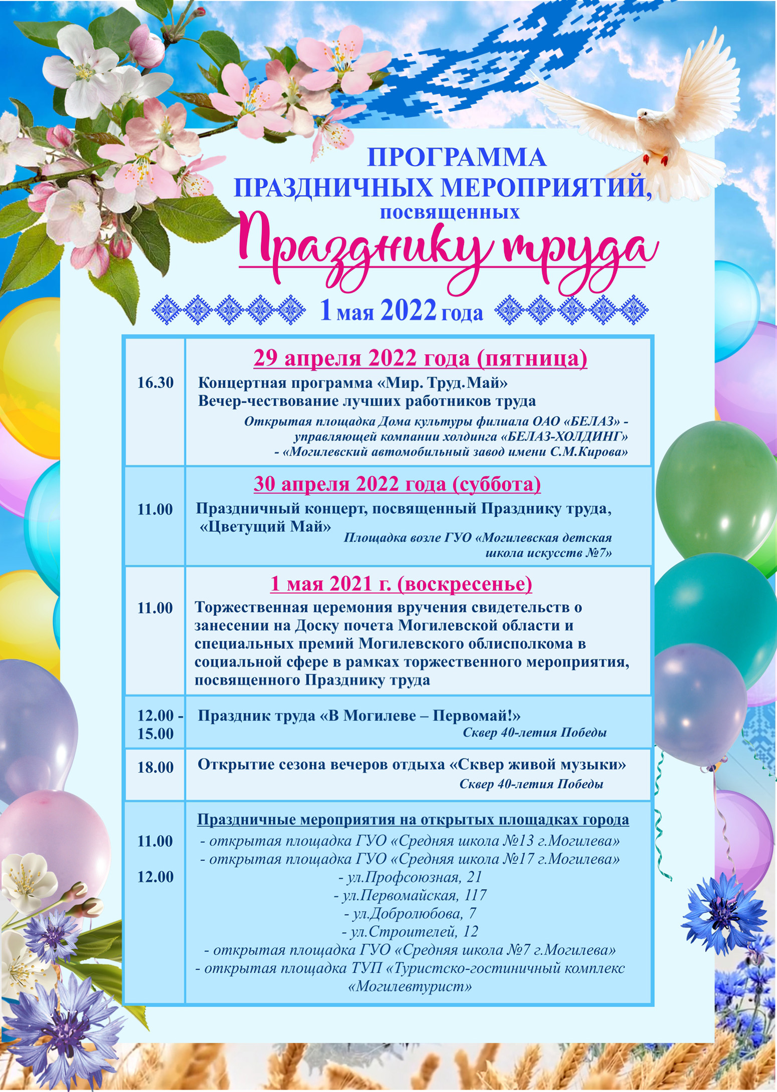 Программа праздничных мероприятий в Могилеве, посвященных Празднику труда.