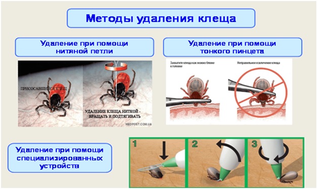 - при обнаружении присосавшегося клеща его необходимо в кратчайшие сроки удалить в любом территориальном медицинском учреждении или самостоятельно (с помощью хлопчатобумажной нити или пинцета);