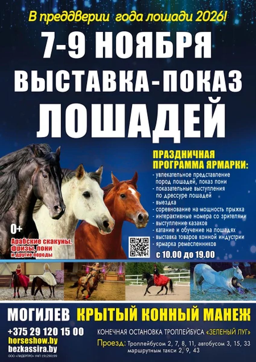 С 7 по 9 ноября в конном манеже южнее деревни Городок (Могилевский район, Буйничский с/с, 19) пройдет выставка-шоу породистых лошадей «Осень-2025». Мероприятие будет открыто для посетителей ежедневно с 10:00 до 19:00.