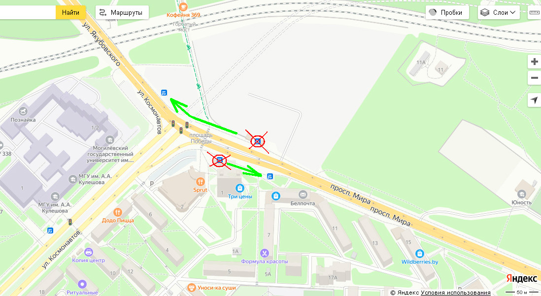 Так остановочный пункт «пр-т Мира» при движении в сторону ул. Якубовского будет перенесен за перекресток и расположится по ул. Якубовского. Для маршрутов №4, №5, №9, №12, №28, №30, №32, №34, №38.