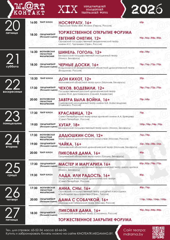 Стартовали продажи билетов на XIX Международный молодежный театральный форум «M.@rt.контакт», который пройдет в Могилеве с 20 по 27 марта. Об этом сообщили в областном драматическом театре.